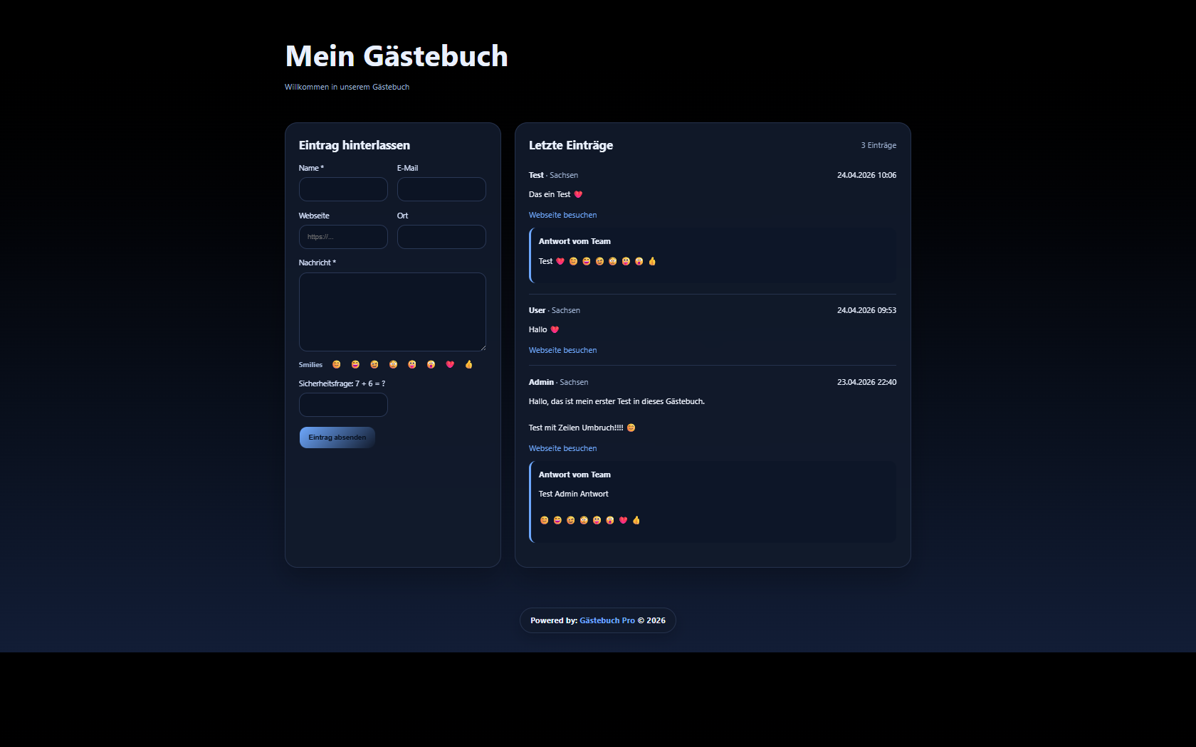 Besucher können schnell und unkompliziert neue Einträge verfassen. Das Frontend wurde modern, sauber und benutzerfreundlich gestaltet.