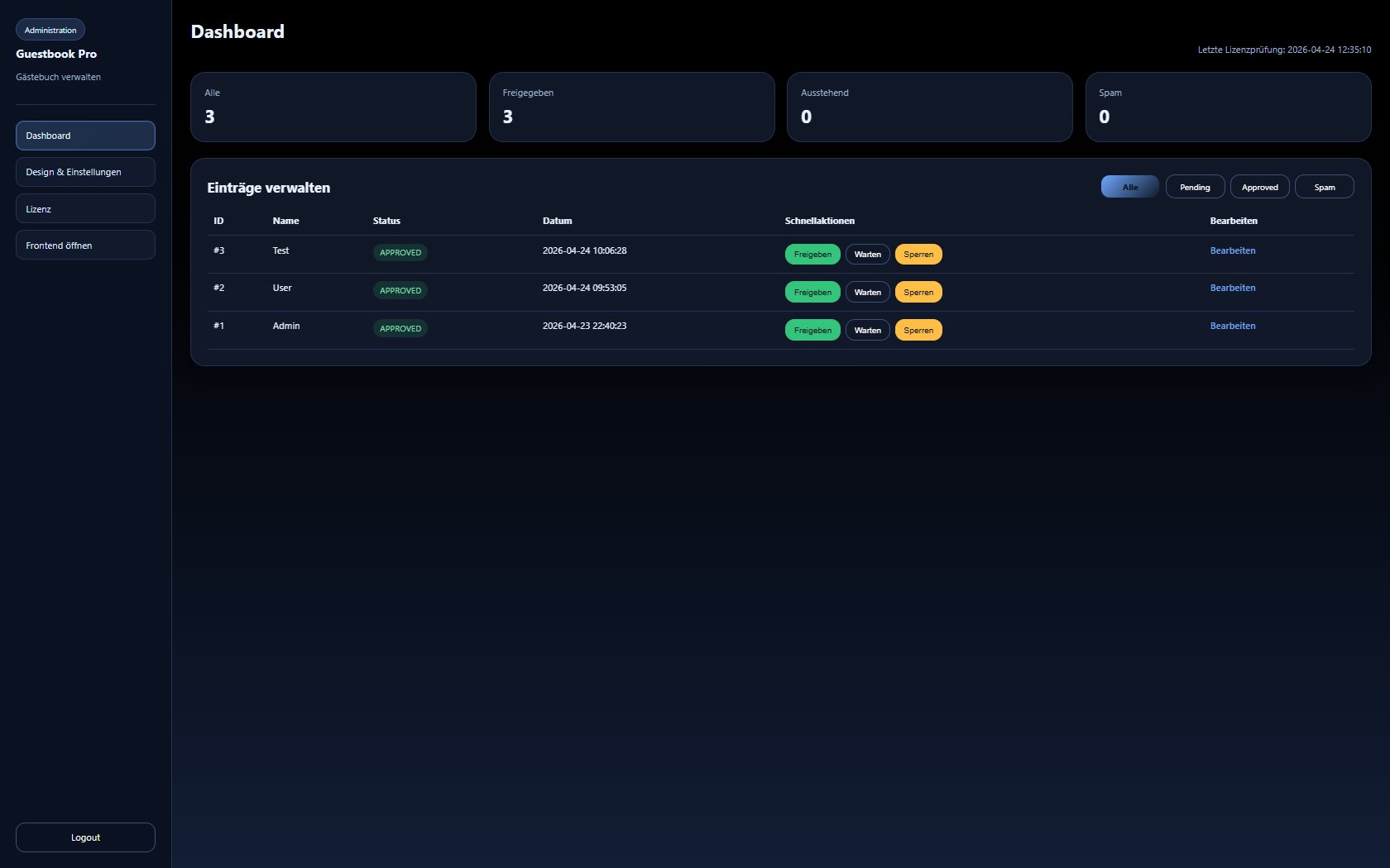 Das Admin-Backend bietet eine komfortable Verwaltung aller Gästebucheinträge.