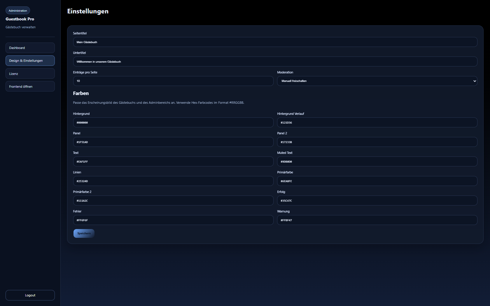 Farben können direkt im Adminbereich über Hex-Farbwerte angepasst werden. Dadurch lässt sich das Gästebuch leicht an das bestehende Webdesign anpassen.